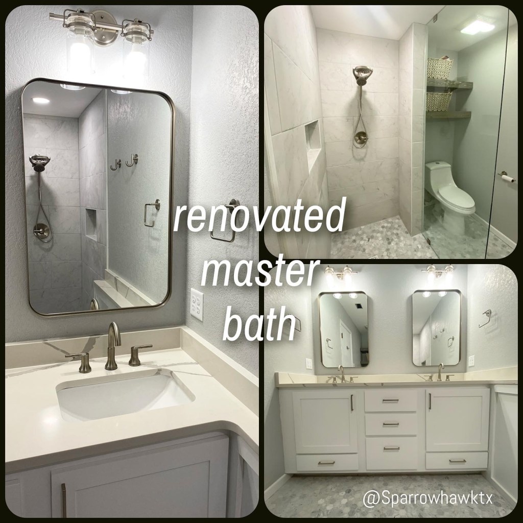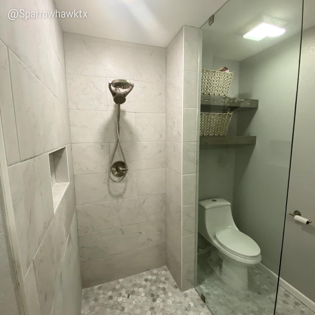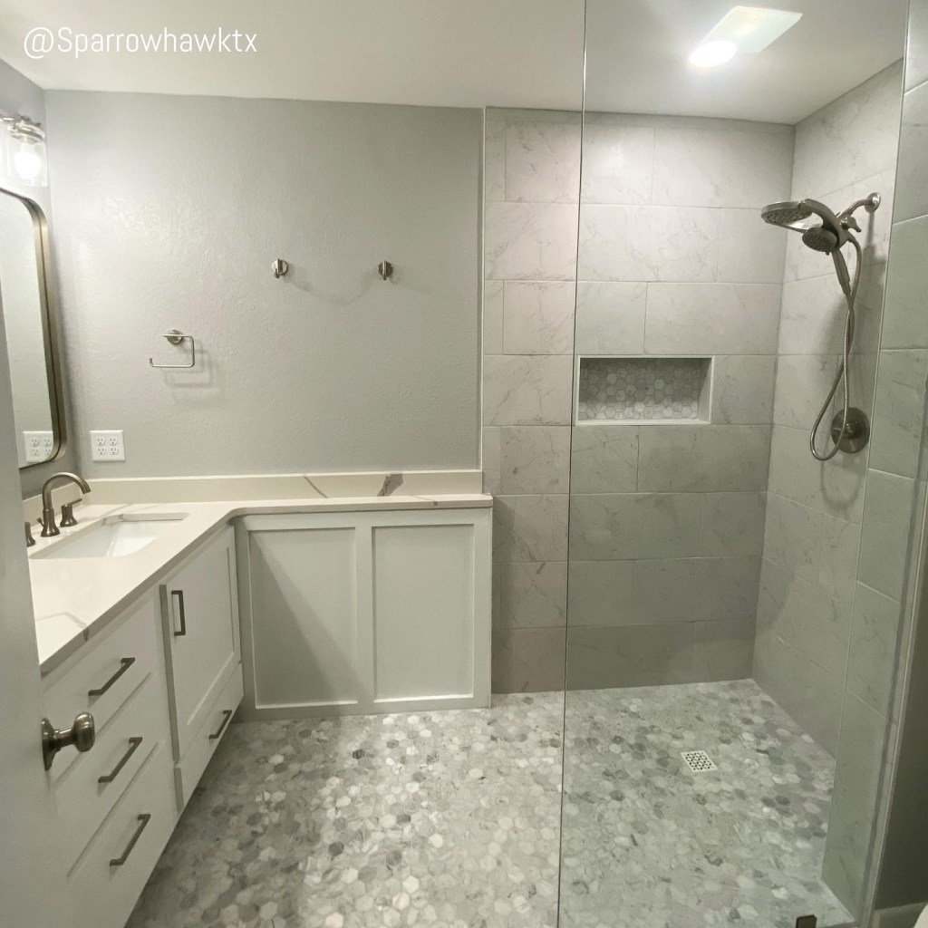 Clients’ bathroom included a cave shower (that’s what I call them!), yellow vanity top, and lots of brown! So, we gutted the whole room. Relocating the vanity allowed us to open the space for a curbless shower and created both a functional and beautiful space for them to enjoy! The only thing we didn’t move was the toilet, but we did add some floating shelves above it, along with floor to ceiling shower glass (for stability).