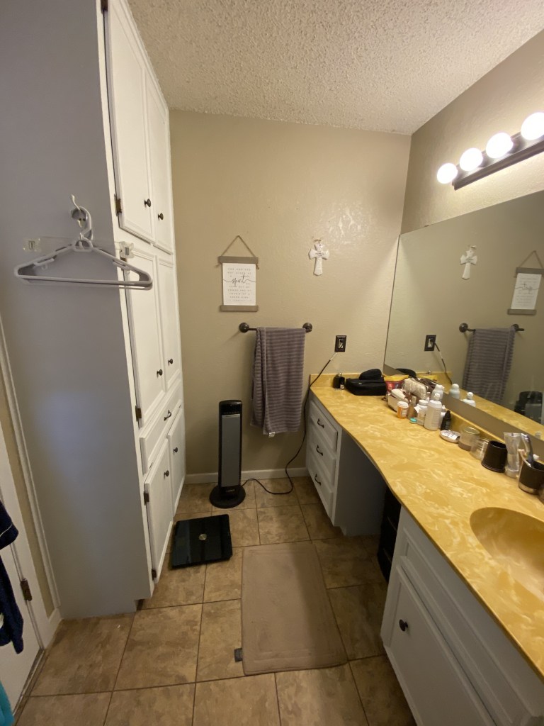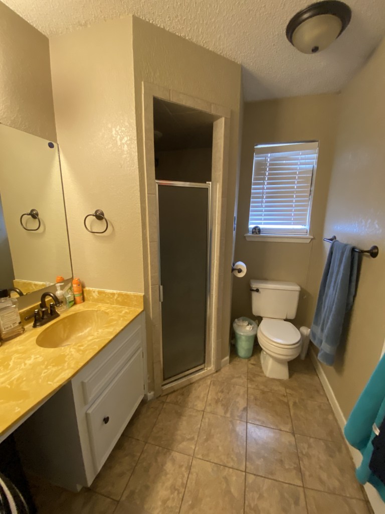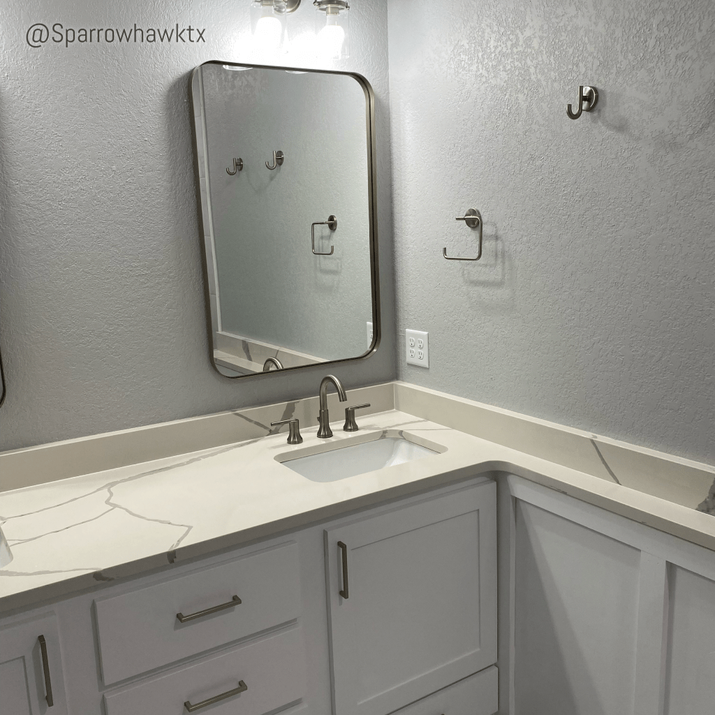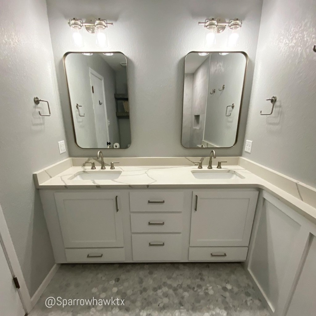 Clients’ bathroom included a cave shower (that’s what I call them!), yellow vanity top, and lots of brown! So, we gutted the whole room. Relocating the vanity allowed us to open the space for a curbless shower and created both a functional and beautiful space for them to enjoy! The only thing we didn’t move was the toilet, but we did add some floating shelves above it, along with floor to ceiling shower glass (for stability).
