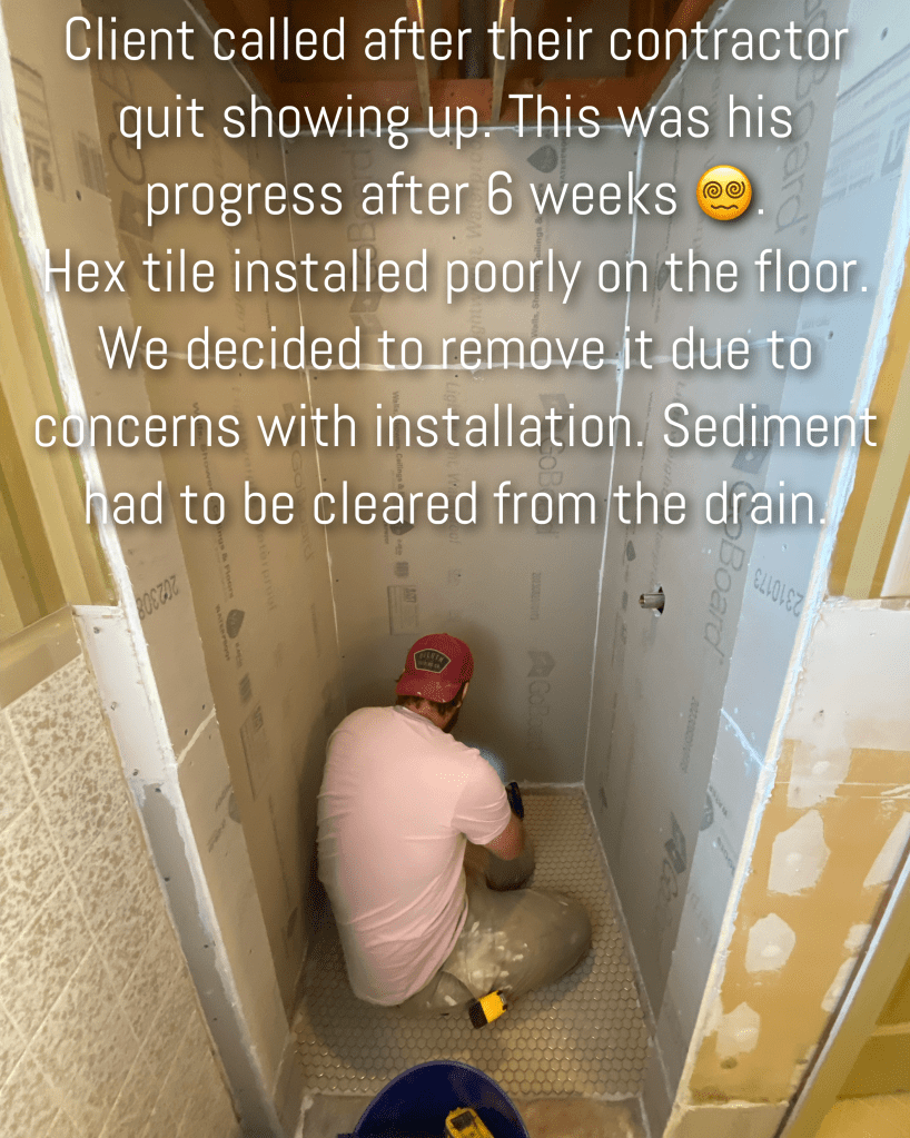 Sometimes people call us when they are already in the middle of a project and need a new contractor to help finish what someone else started. Never a good day when a client has been ghosted or had to fire their contractor. That was the case with this shower. Demo was done and he had started on the tile work but quit showing up.