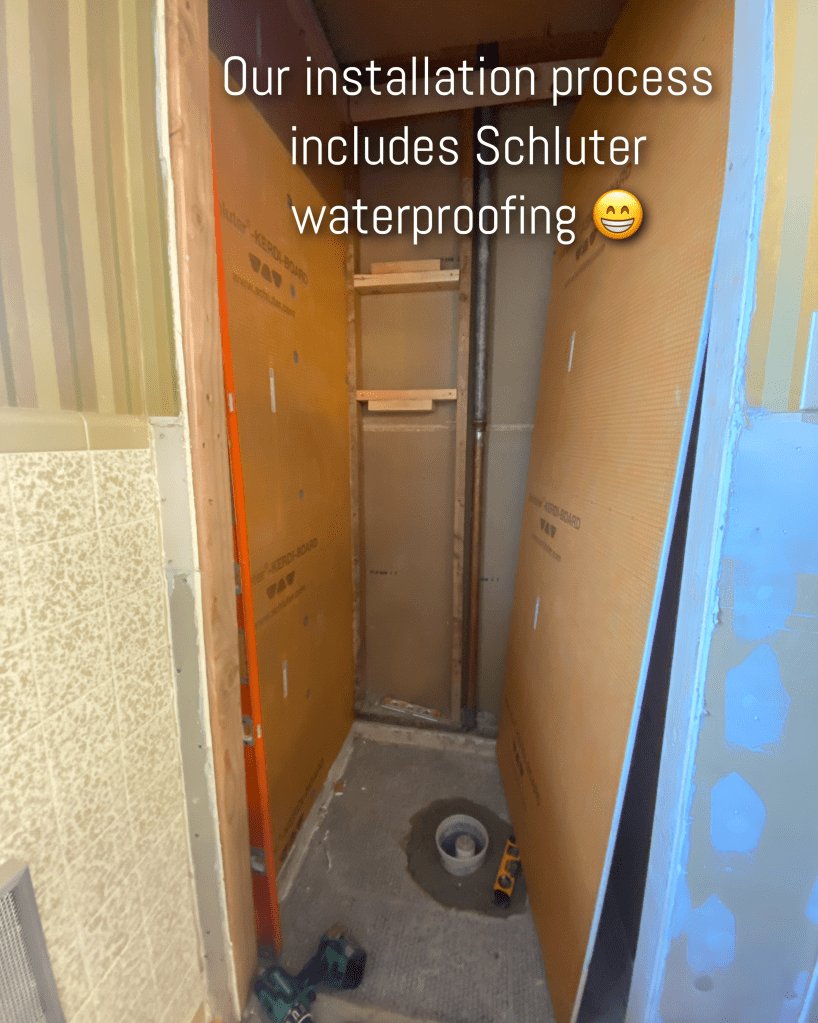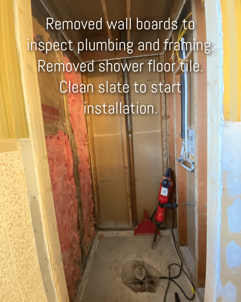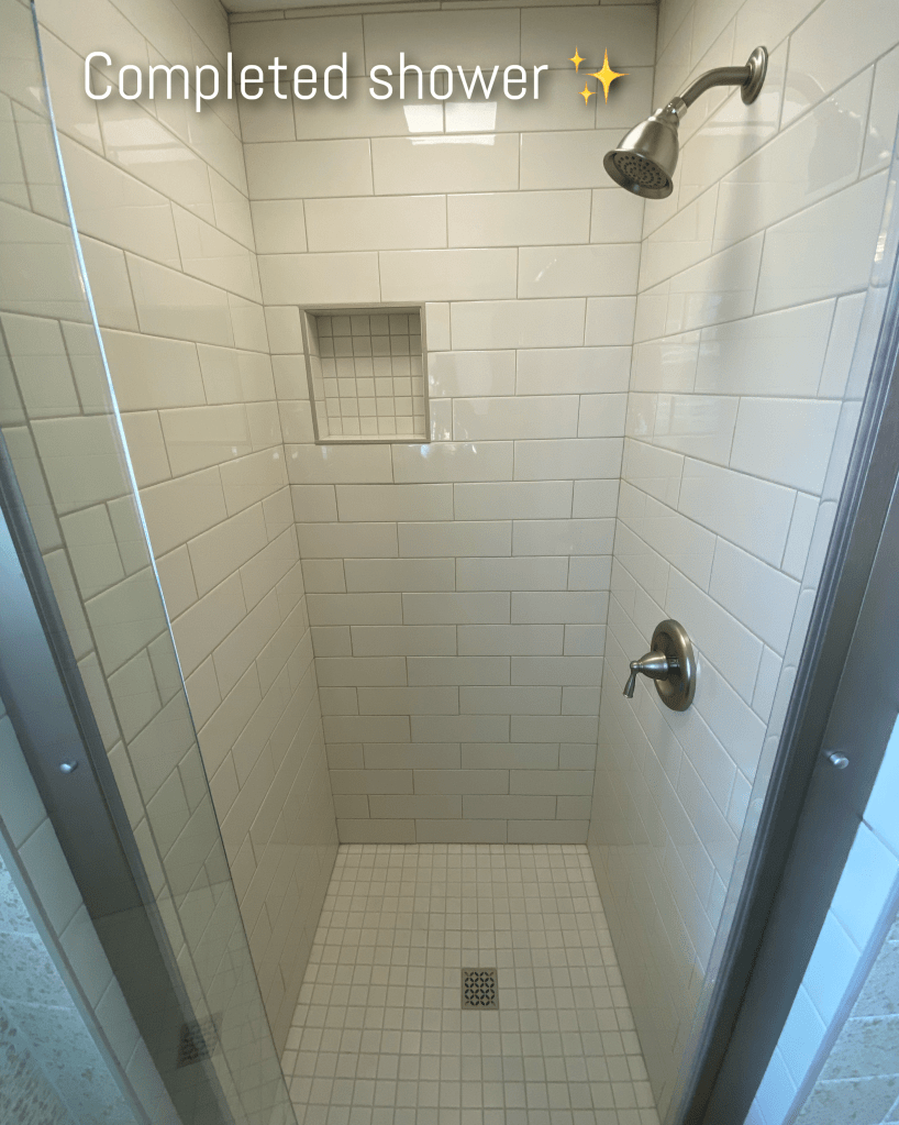 Things you won’t see — we also raised the dropped ceiling in the shower and updated to old light to a shower light/fan.