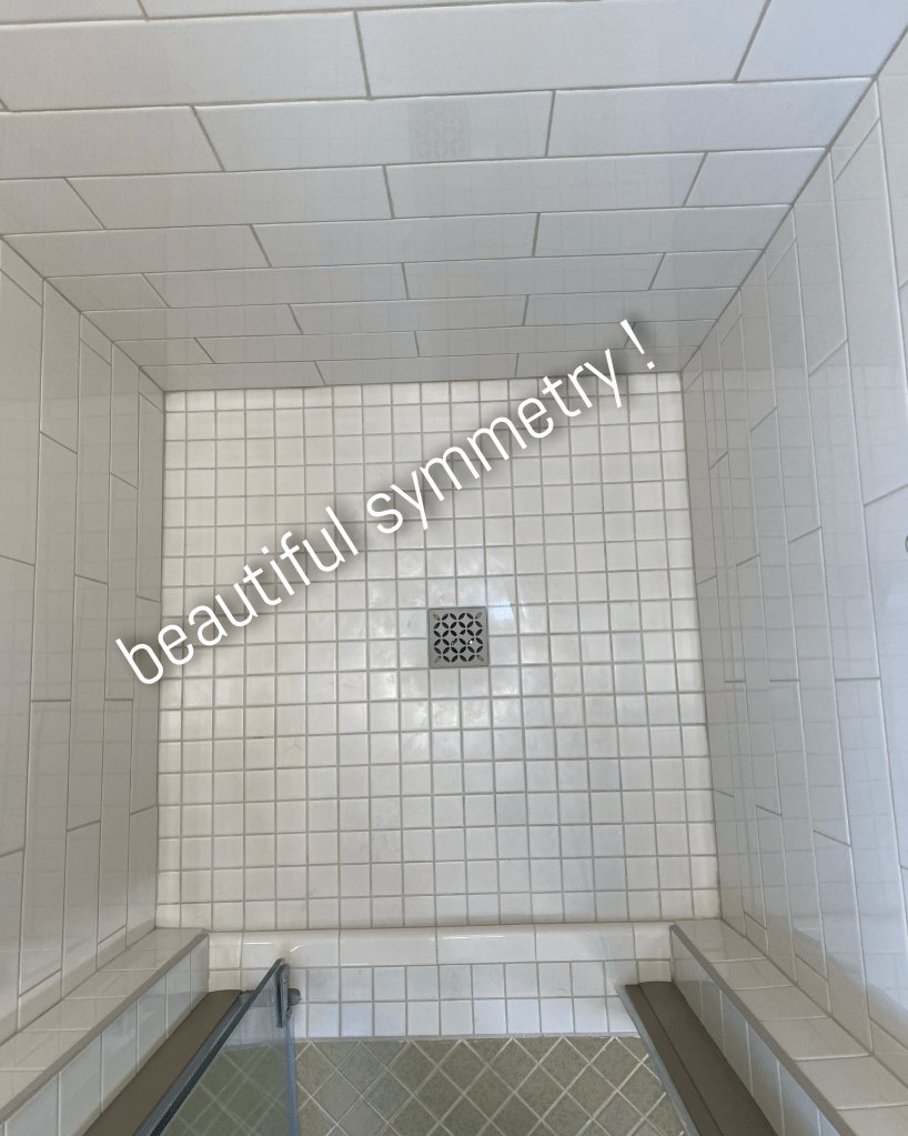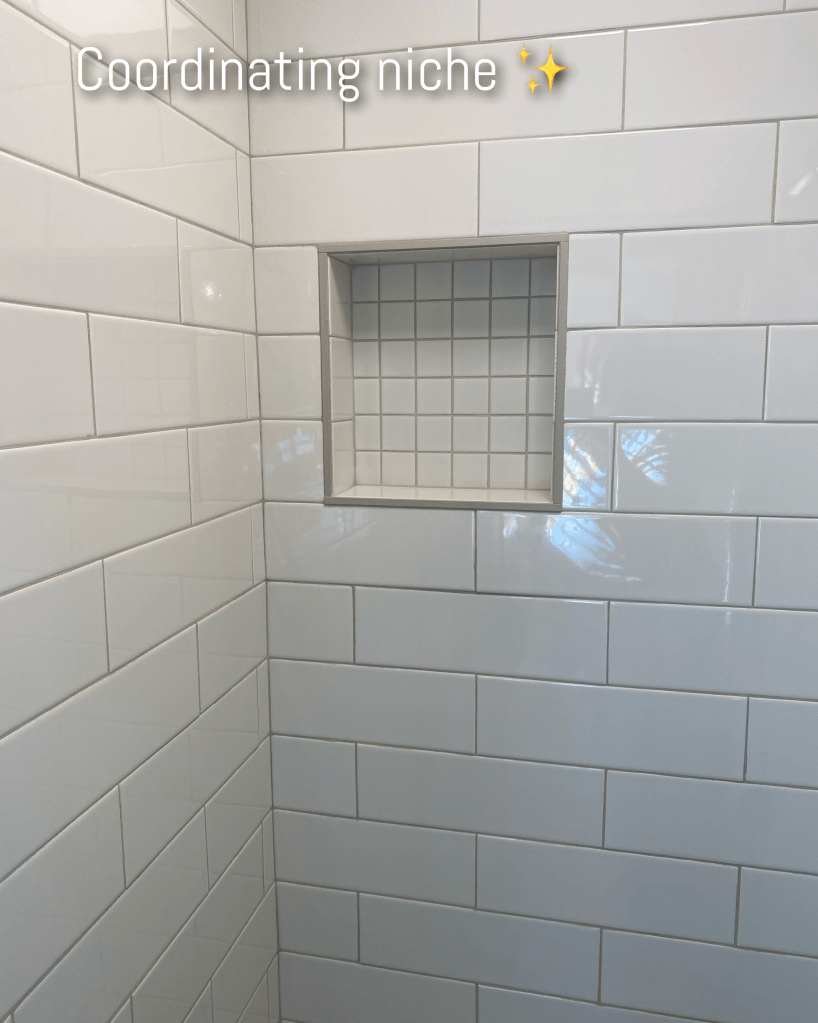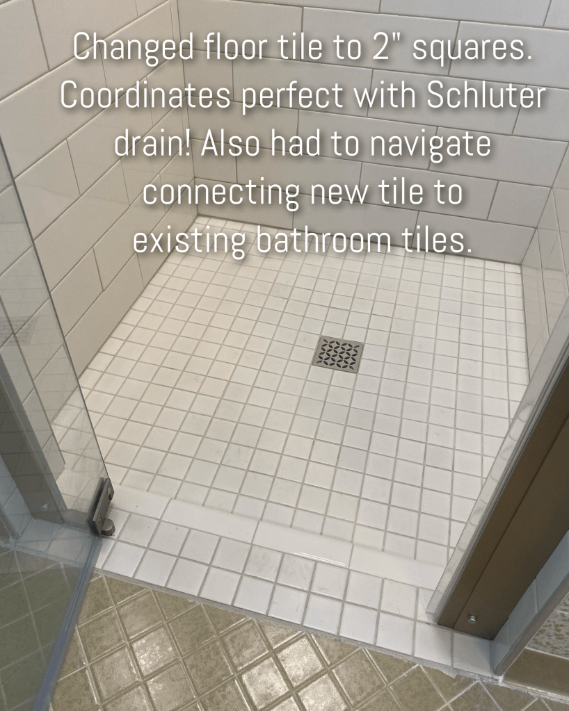 We needed a new shower floor tile since we had to remove the other one. I wanted to find something in stock so we could start asap on the project, so I went to a local supplier, Black Lion Tile Supply, and found a 2″ square shower floor tile in stock that coordinated with the existing wall tile the client had purchased. The 2″ squares line up perfectly with the Schluter drain which is 4″ square. Very clean finish! They also look great in the shower niche!