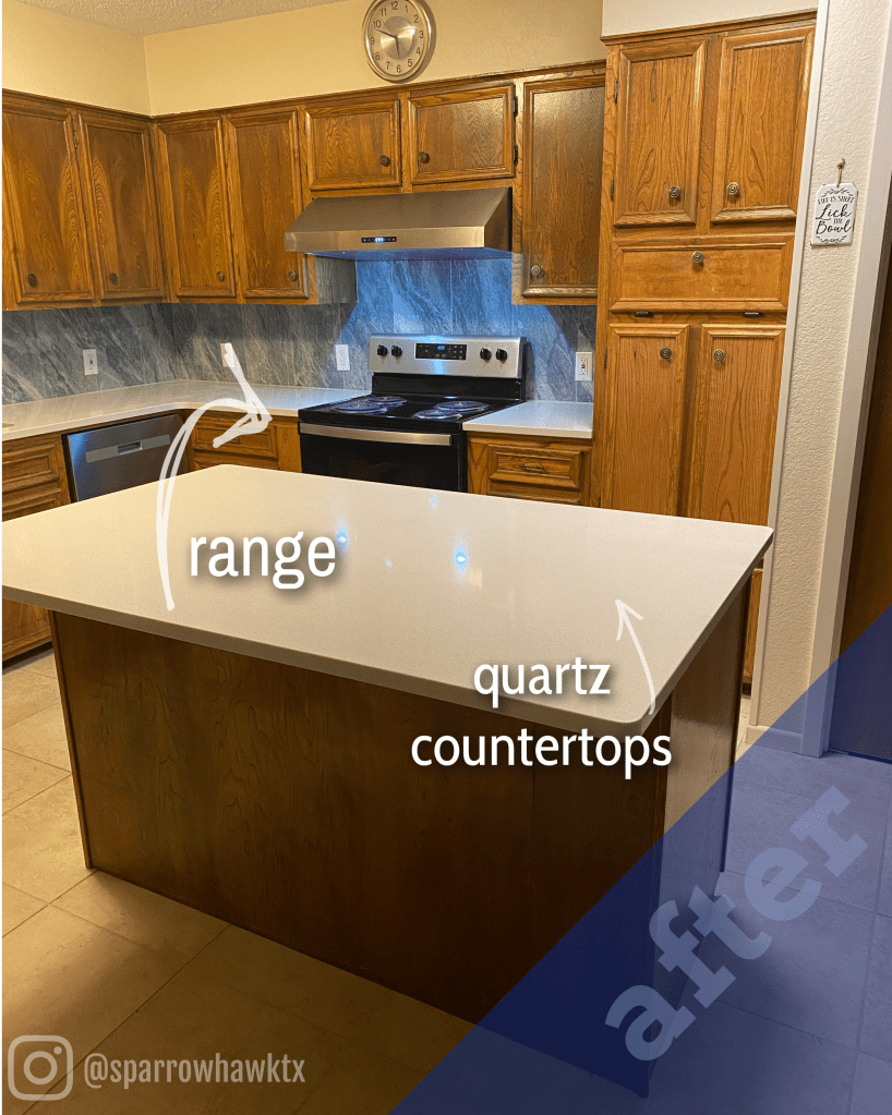 For this kitchen update, the client requested (1) white quartz countertops with (2) a colorful backsplash with minimal grout lines and (3) removing her cooktop to make space for a range.