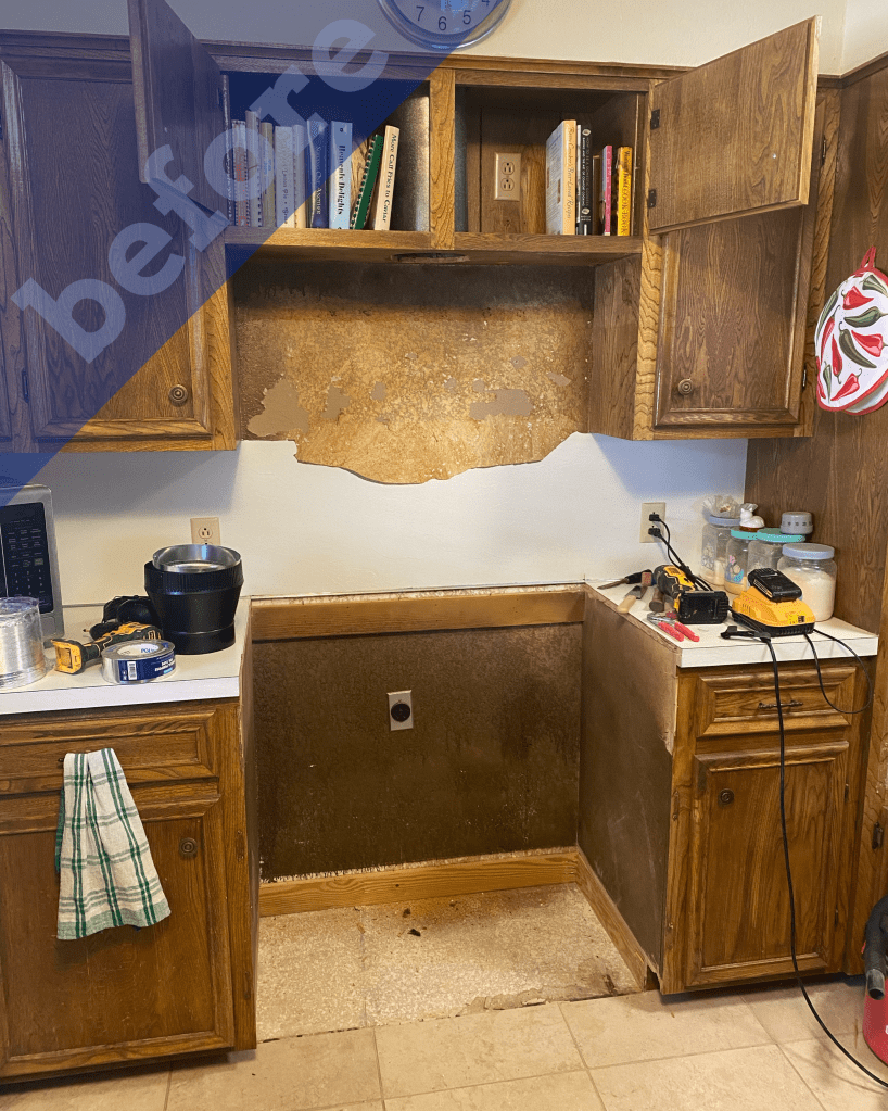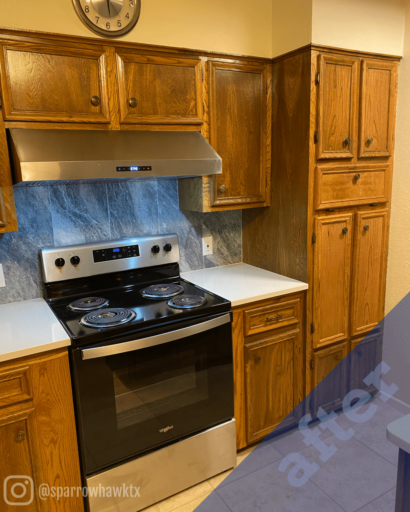 Here is a quick before and after picture of the overall changes. There is a lot going on in this picture that you might not notice! We not only removed the cooktop, but also the built-in oven. Joseph made two new doors to cover the open cabinet from the oven and added wood to the existing cabinet to box in the range. The carpentry was a lot of delicate work, but it turned out great!